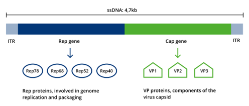 The AAV genome is flanked by two terminal repeats (ITRs) essential for packaging the viral DNA, replication, transcription and site-specific integration. The genome consist of the Rep gene that encodes four rep proteins which are essential for DNA replication, packaging the viral genome and its integration into the host DNA. Also the Cap gene is present in its genome which encodes three viral capsid proteins (VP) that form the virus capsid.