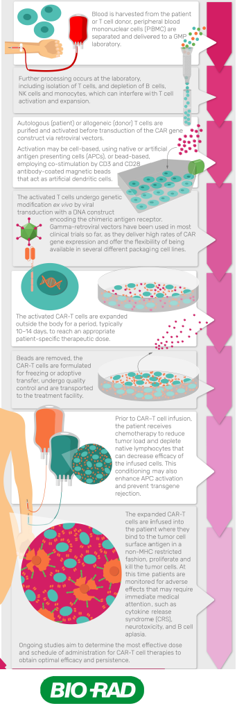 A chimeric antigen receptor is an engineered fusion protein. The extracellular targeting domain is derived from a single-chain fragment variable (scFv) from a monoclonal antibody, and enables the CAR-T cell to recognize and bind to the antigen on the cancer cell. A hinge or spacer peptide and a transmembrane domain provide the link to the intracellular part. This is made up of one or more domains from T cell receptor intracellular signaling and co-stimulatory molecules, and provides a signal to stimulate T cell activation. Gene transfer technology is used to reprogram T cells taken from a patient or donor to express CARs. Following successful transduction, expansion, and infusion into the patient, these engineered CAR-T cells proliferate and specifically target and induce the killing of tumor cells, with the purpose of controlling and eliminating the cancer.