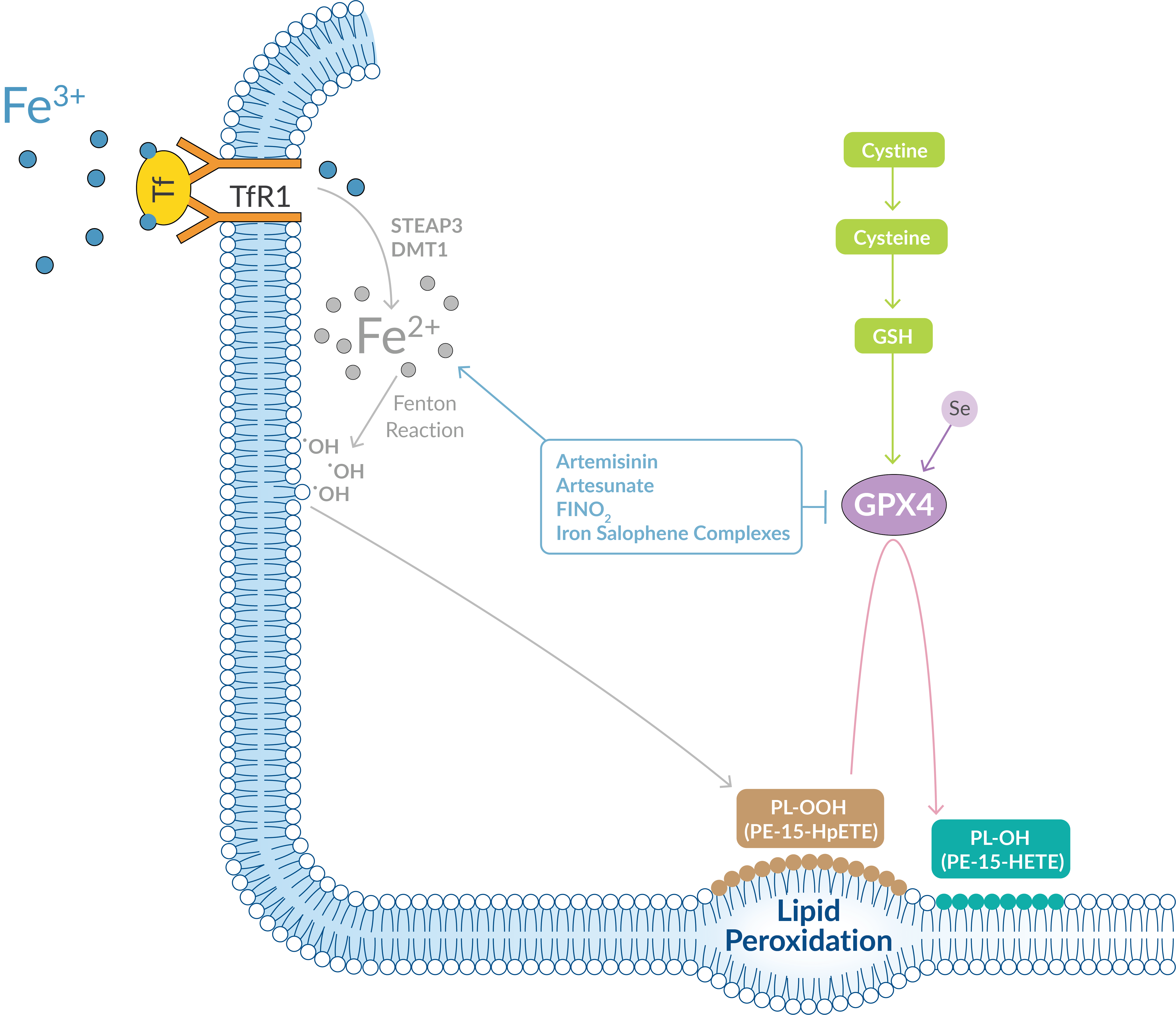 Any increases in iron uptake or reduced capacity for iron storage contributes to iron overload and the potential to generate highly reactive hydroxyl radicals through the Fenton reaction. These radicals can oxidize PUFAs in lipid membranes, creating lipid hydroperoxides. Cayman Chemical offers several endoperoxides that act as ferroptosis inducers by oxidizing Fe2+, which promotes the production of lipid ROS.