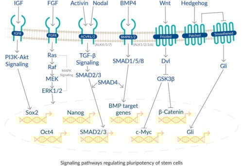 This product line includes activators and inhibitors of signaling pathways that regulate stem cell pluripotency, including TGF-β, BMP4, Wnt, hedgehog, and growth factor signaling pathways. Targets in growth factor signaling pathways include MEK, ERK1/2, and growth factor receptors such as EGFR and FGFR. Cayman offers inhibitors targeting the receptors ALK4, ALK5, and ALK7 in the activin/nodal/TGF-β pathway, as well as pathway activators. Cayman also provides small molecules targeting the receptors ALK1, ALK2, ALK3, and ALK6 in the BMP4 pathway, GSK3β in the Wnt signaling pathway, and Smoothened (Smo) in the hedgehog pathway, as well as compounds to control apoptosis occurring during stem cell self-renewal and proliferation.